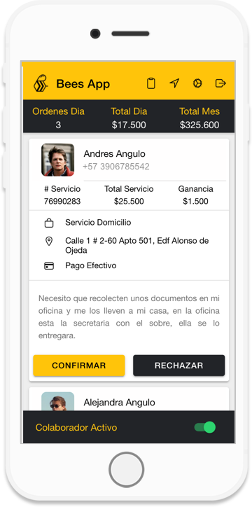 "Veronica es una colaboradora y recibe la notificación de Juan para el servicio, ella recolecta los documentos y se los lleva a casa."